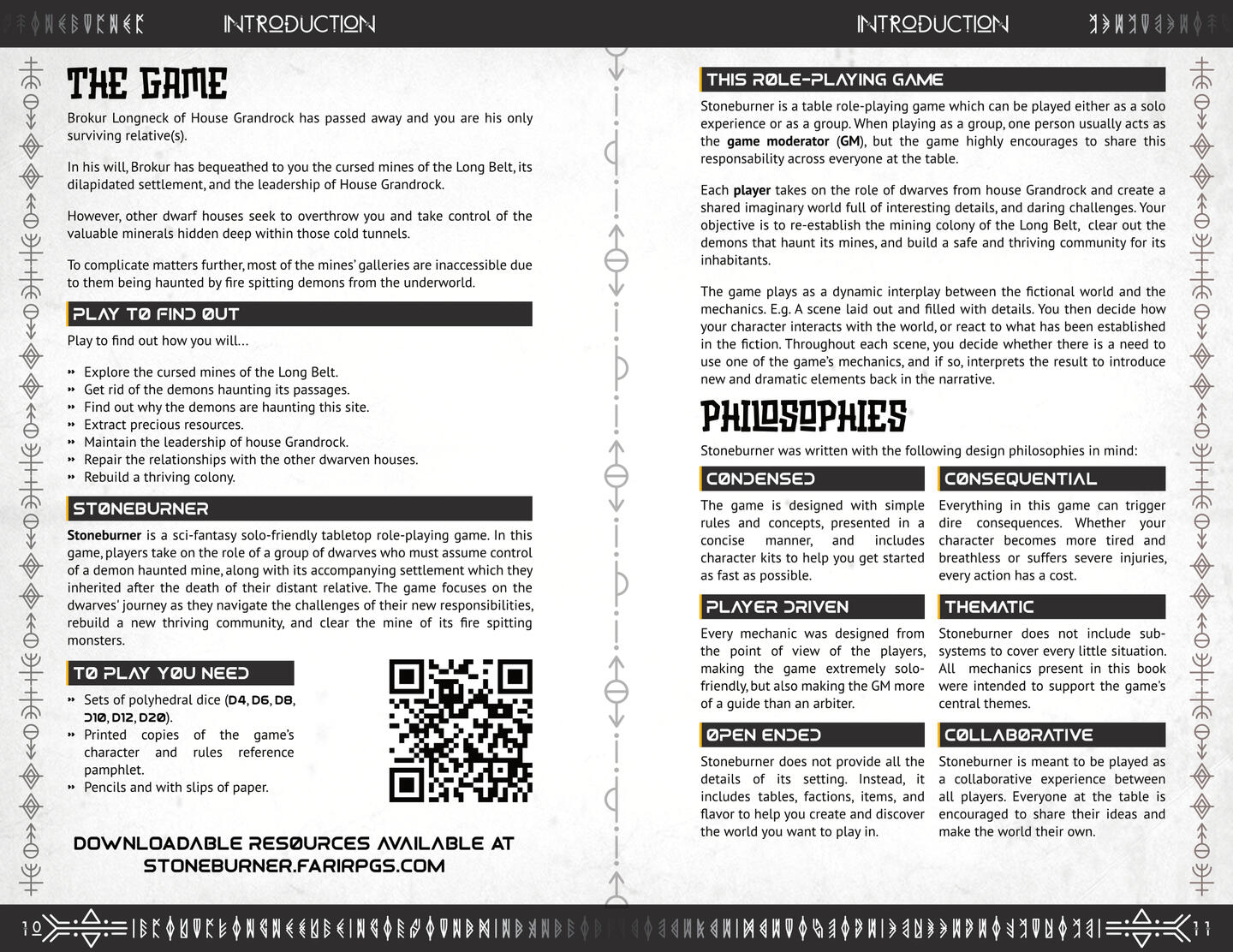 Stoneburner is a sci-fantasy solo-friendly demon-hunting community-building tabletop role-playing game.Inspired by the new school revolution movement, players take on the role of a group of dwarves who must assume control of a demon haunted mine, along with its accompanying settlement. Settlement which they inherited after the death of their distant relative.The game focuses on the dwarves' journey as they navigate the challenges of their new responsibilities, rebuild a new thriving community, and clear the mine of its fire spitting monsters.
